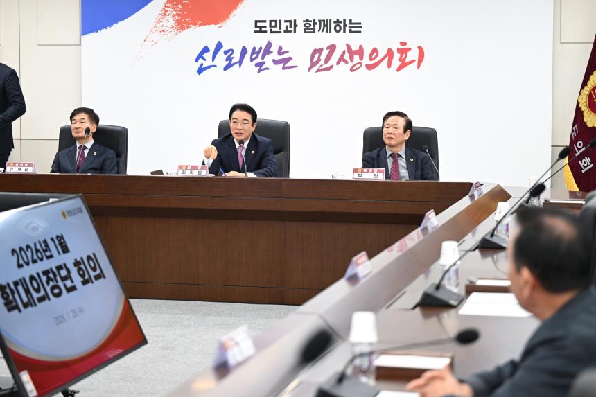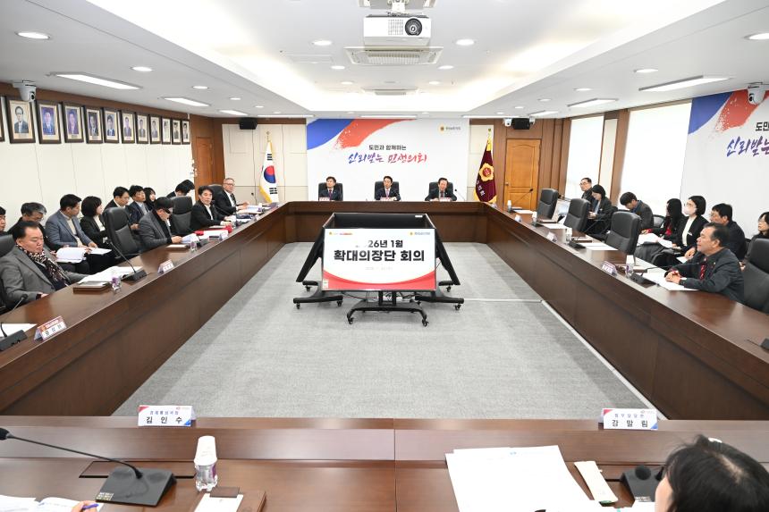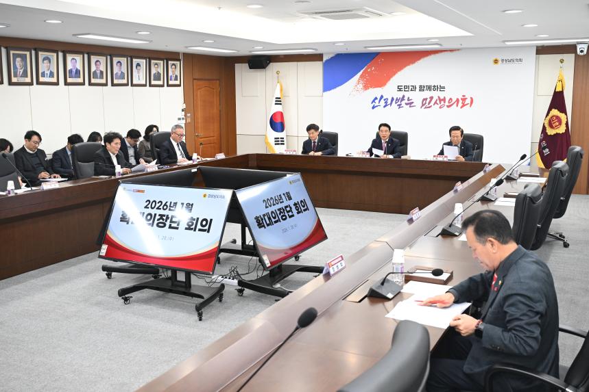 경상남도의회(의장 최학범)는 1월 28일 도의회 의정회의실에서 최학범 의장을 비롯하여 부의장, 상임위원장, 국민의힘 대표의원 등이 참석한 확대의장단 회의를열었다.